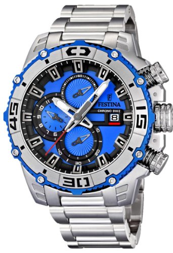Upgrade to style and sophistication with this elegant Festina watch. Boasting a stunning 48mm stainless steel case matched with a secure stainless steel band, this timepiece makes an ideal accessory for any affair. The blue dial sits under a mineral crystal, which combines a stylish look and an easy-to-read display. The sleek, subtle design instills this watch with an unmistakable sense of luxury that cannot be matched. Additional features include water resistance up to 100 meters, chronograph, date and measures seconds.
